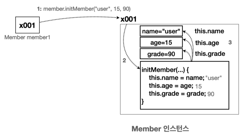 public class MemberInit { String name; void initMember(String name, int age, int grade) { this.name = name; // this 는 인스턴스 자신을 가리킨다 } }