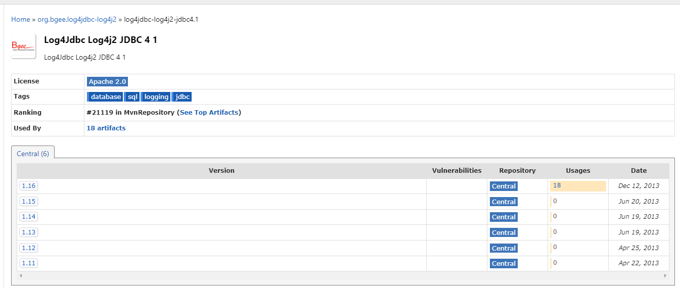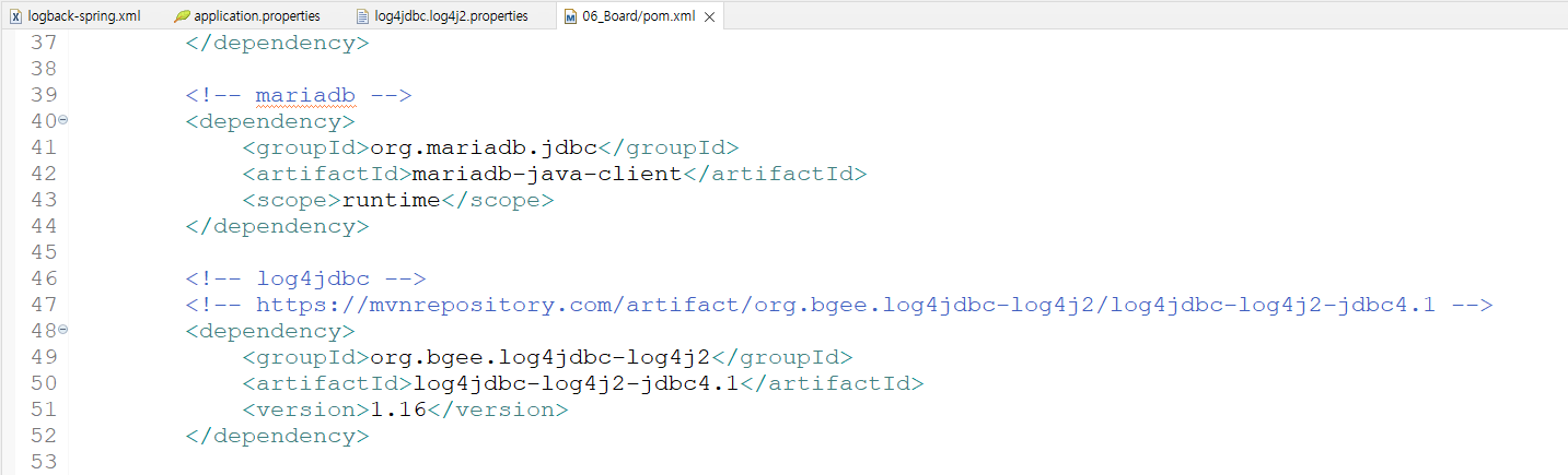 <!-- log4jdbc --> <!-- https://mvnrepository.com/artifact/org.bgee.log4jdbc-log4j2/log4jdbc-log4j2-jdbc4.1 --> <dependency> <groupId>org.bgee.log4jdbc-log4j2</groupId> <artifactId>log4jdbc-log4j2-jdbc4.1</artifactId> <version>1.16</version> </dependency>