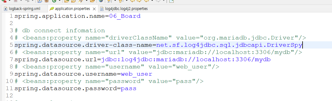 log4jdbc.log4j2.properties0.00MBlogback-spring.xml0.00MBlog4jdbc.log4j2.properties : log4j 와 db driver 매핑