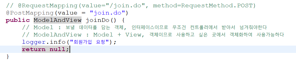 // @RequestMapping(value="/join.do", method=RequestMethod.POST) @PostMapping(value = "join.do") public ModelAndView joinDo() { // Model : 보낼 데이터를 담는 객체, 인터페이스이므로 무조건 컨트롤러에서 받아서 넘겨줘야한다 // ModelAndView : Model + View, 객체이므로 사용하고 싶은 곳에서 객체화하여 사용가능하다 logger.info("회원가입 요청"); return null; }동적쿼리에서 IF문 사용방법