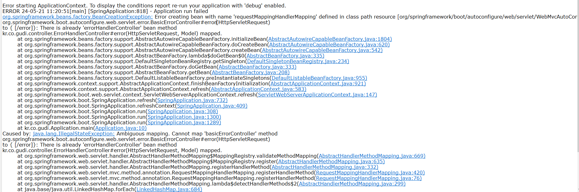 Error starting ApplicationContext. To display the conditions report re-run your application with 'debug' enabled. ERROR 24-05-21 11:20:51[main] [SpringApplication:818] - Application run failed org.springframework.beans.factory.BeanCreationException: Error creating bean with name 'requestMappingHandlerMapping' defined in class path resource [org/springframework/boot/autoconfigure/web/servlet/WebMvcAutoConfiguration$EnableWebMvcConfiguration.class]: Invocation of init method failed; nested exception is java.lang.IllegalStateException: Ambiguous mapping. Cannot map 'basicErrorController' method org.springframework.boot.autoconfigure.web.servlet.error.BasicErrorController#error(HttpServletRequest) to { [/error]}: There is already 'errorHandlerController' bean method에러 컨트롤러를 스프링에서 이미 사용하고 있기 때문에 인터페이스 형태로 구현 받은 컨트롤러에서만 사용가능하다