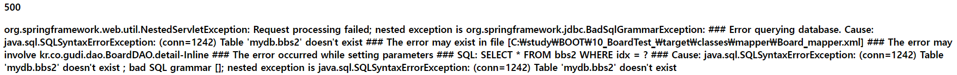 @Controller public class ErrorHandlerController implements ErrorController { Logger logger = LoggerFactory.getLogger(getClass()); @RequestMapping(value="/error") public String error(HttpServletRequest request, Model model) { logger.info("error 요청"); model.addAttribute("code", request.getAttribute(RequestDispatcher.ERROR_STATUS_CODE)); model.addAttribute("exception", request.getAttribute(RequestDispatcher.ERROR_EXCEPTION)); return "error"; } }<%@ page language="java" contentType="text/html; charset=UTF-8" pageEncoding="UTF-8"%> <%@ taglib prefix="c" uri="http://java.sun.com/jsp/jstl/core" %> <html> <head> <meta charset="UTF-8"> <title>Insert title here</title> <script src="https://code.jquery.com/jquery-3.7.1.min.js"></script> <style> </style> </head> <body> <h3>${code} 에러가 발생했습니다</h3> <a href="./list">리스트 돌아가기</a> </body> <script> </script> </html>