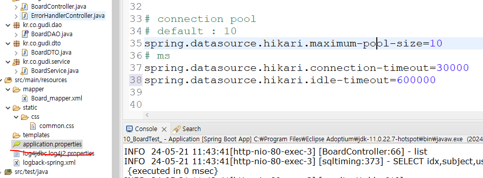 # connection pool # default : 10 히카리풀에서 미리 생성하는 갯수(많으면 많을 수록 초기 속도가 느려진다) spring.datasource.hikari.maximum-pool-size=10 # ms 커넥션을 요청하고 기다리는 시간(밀리세컨드 단위) - 30초 이 시간이 넘어가면 SQLexception 발생 spring.datasource.hikari.connection-timeout=30000 아무것도 하지 않고 놀고 있는 커넥션을 기다려주는 시간(밀리세컨드 단위) - 10분 이후 폐기처리 한다 spring.datasource.hikari.idle-timeout=600000 커넥션 최대 유지 시간 - 30분 30분이 지났다고 바로 폐기하는건 아니고, 작업이 끝나면 바로 폐기한다 spring.datasource.hikari.max-lifetime=1800000@Autowired