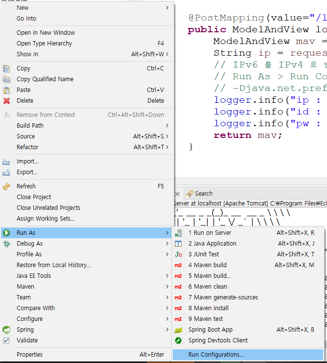 // application.properties 에 있는 값 가져오기 @Value("${user.id}") private String user_id; @Value("${user.pw}") private String user_pw; @Value("${user.ip}") private String user_ip; public ModelAndView login(String id, String pw, String ip) { ModelAndView mav = new ModelAndView(); logger.info("user_id : {}", user_id); logger.info("user_pw : {}", user_pw); logger.info("user_ip : {}", user_ip); String msg = "관리자 계정으로 접속할 수 없습니다"; String page = "login"; if (id.equals(user_id) && pw.equals(user_pw) && ip.equals(user_ip)) { msg="관리자님 안녕하세요"; page="result"; } mav.addObject("msg", msg); mav.setViewName(page); return mav; }콘솔에 아이피 보이는 IPv6 형식을 IPv4 로 변경하기