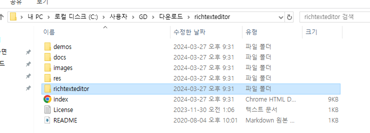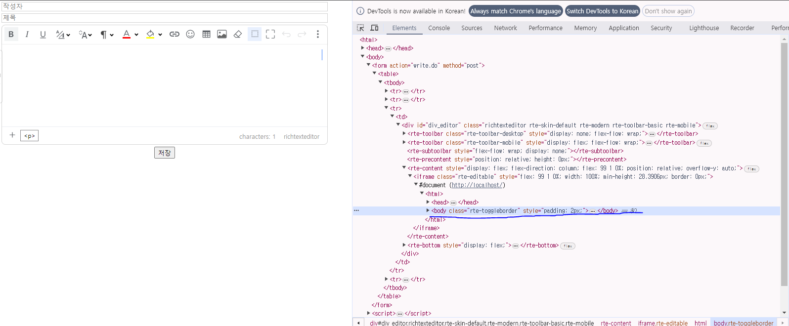<%@ page language="java" contentType="text/html; charset=UTF-8" pageEncoding="UTF-8"%> <%@ taglib prefix="c" uri="http://java.sun.com/jsp/jstl/core" %> <html> <head> <meta charset="UTF-8"> <title>Insert title here</title> <link rel="stylesheet" href="res/style.css" /> <link rel="stylesheet" href="richtexteditor/rte_theme_default.css" /> <script type="text/javascript" src="richtexteditor/rte.js"></script> <script type="text/javascript" src='richtexteditor/plugins/all_plugins.js'></script> <script src="https://code.jquery.com/jquery-3.7.1.min.js"></script> <style> </style> </head> <body> <form action="write.do" method="post"> <table> <tr> <td><input type="text" name="user_name" placeholder="작성자"/></td> </tr> <tr> <td><input type="text" name="subject" placeholder="제목"/></td> </tr> <tr> <td><div id="div_editor"></div></td> </tr> </table> </form> </body> <script> var config = {} config.toolbar = "basic"; var editor = new RichTextEditor("#div_editor", config); </script> </html>그냥 요청하면 static 폴더 안에 아무것도 넣지 않았기 때문에 경로를 찾지 못하는 상황이다