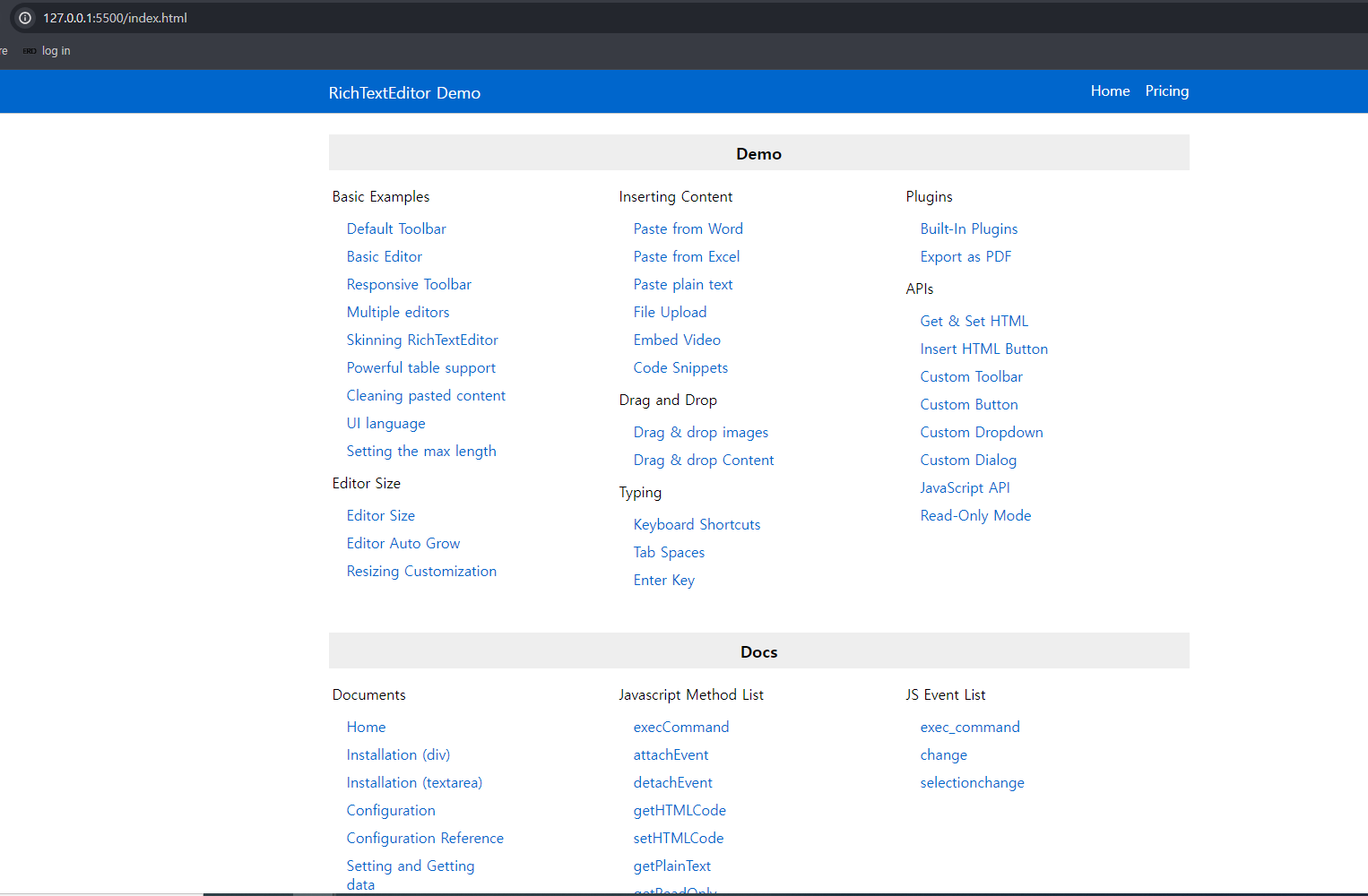 <!DOCTYPE html> <html lang="en" xmlns="http://www.w3.org/1999/xhtml" style="display:flex;height:100%;flex-direction:column;"> <head> <meta charset="utf-8" /> <title>Basic Editor</title> <base href='../' /> <link rel="stylesheet" href="res/style.css" /> <link rel="stylesheet" href="richtexteditor/rte_theme_default.css" /> <script type="text/javascript" src="richtexteditor/rte.js"></script> <script>RTE_DefaultConfig.url_base='richtexteditor'</script> <script type="text/javascript" src='richtexteditor/plugins/all_plugins.js'></script> </head> <body> <div> <div id="div_editor"></div> </div> </body> <script> var config = {} config.toolbar = "basic"; var editor = new RichTextEditor("#div_editor", config); </script> </html>예제 실행