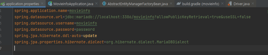 학원에서 실습할때에는 Mybatis 를 사용해서 JDBC 를 통해서 데이터베이스와 통신했었는데 이번에 간단한 사이트를 만들려고 JPA 로 환경을 구축하려고 했다. 맨 처음 movieinfo 데이터베이스를 생성하고 이를 spring 프레임워크랑 연결하는 작업이 전혀 이루어지지 않아서 작성하게 됐다.