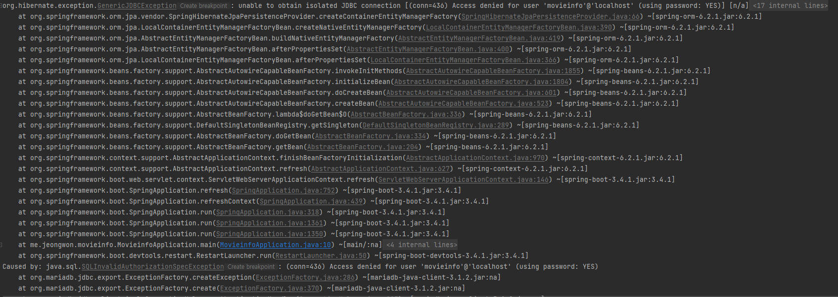org.hibernate.exception.GenericJDBCException: unable to obtain isolated JDBC connection [(conn=436) Access denied for user 'movieinfo'@'localhost' (using password: YES)] [n/a]데이터베이스에 접근하려고 했지만 어떤 이유인지는 모르겠지만 접속 하지 못한 상황이다.